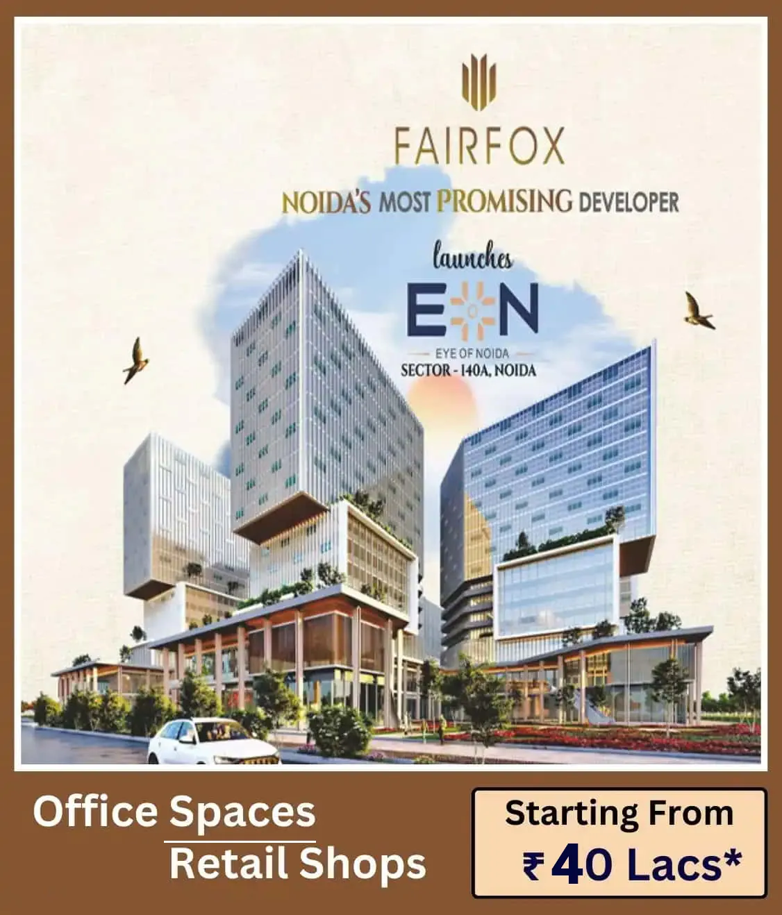 SECTOR 140A, NOIDAFairfox EON stands out as a landmark commercial destination in Sector 140A, Noida, thoughtfully designed to elevate modern business experiences. The project features high-end retail outlets, premium office spaces, a vibrant food court, and lifestyle-focused zones, making it a complete commercial ecosystem. Positioned directly on the Noida Expressway, it enjoys excellent frontage, seamless connectivity, and unmatched visibility.